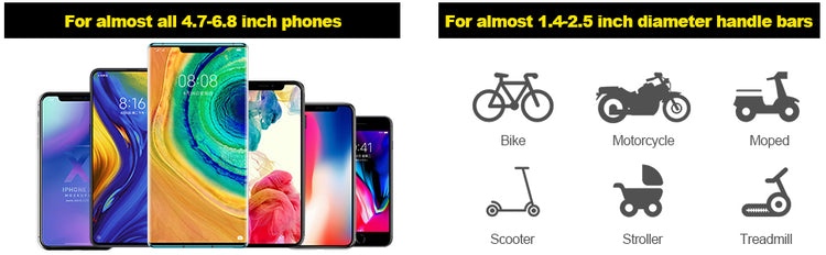 - [Great Compatibility] This motorcycle phone holder is equipped with stretchable silica gel, which can fit 4 to 6.8 inch mobile phones(width more than 60mm, length more than 130mm), such as iPhone 12/11/Xs/X/8/7/6 series, Samsung Galaxy/Note/A series, LG G series, Etc.