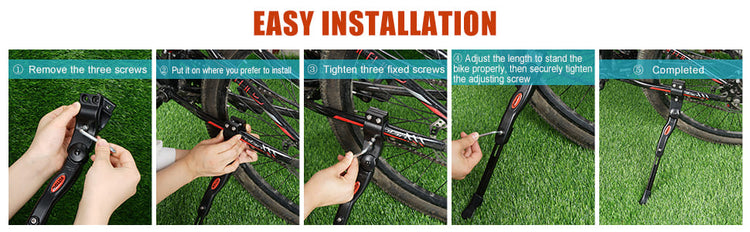 【Easy To Install】 To install the rear kickstand, all you need is a tool. Remove the three screws at the top of the bicycle kickstand and place it where you want it, then tighten three fixed screws and adjust the length by the middle bolt to properly stand your bike.