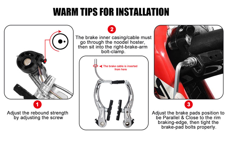 Nice Micro-adjustable: Each brake arm has a micro-adjusting nut, which can be adjusted for brake arm rebounding power, it will make your braking more efficient and comfortable. And the brake lever pivot can do micro-adjusting as well after you mounted the brakes, it will move the brake pads a little bit more close to the rim or away from the rim by tightening or loosing the inner cables.
